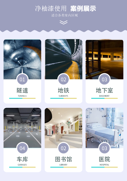 可用于隧道、地鐵、防空洞、地下室等地下建筑;水電站、設(shè)備間、倉庫、車庫、冷庫等易潮濕場所;博物館、體育館、收藏室、圖書館、禮堂、車站、機(jī)場等公共建筑;醫(yī)院、自來水廠、食品廠等衛(wèi)生場所。