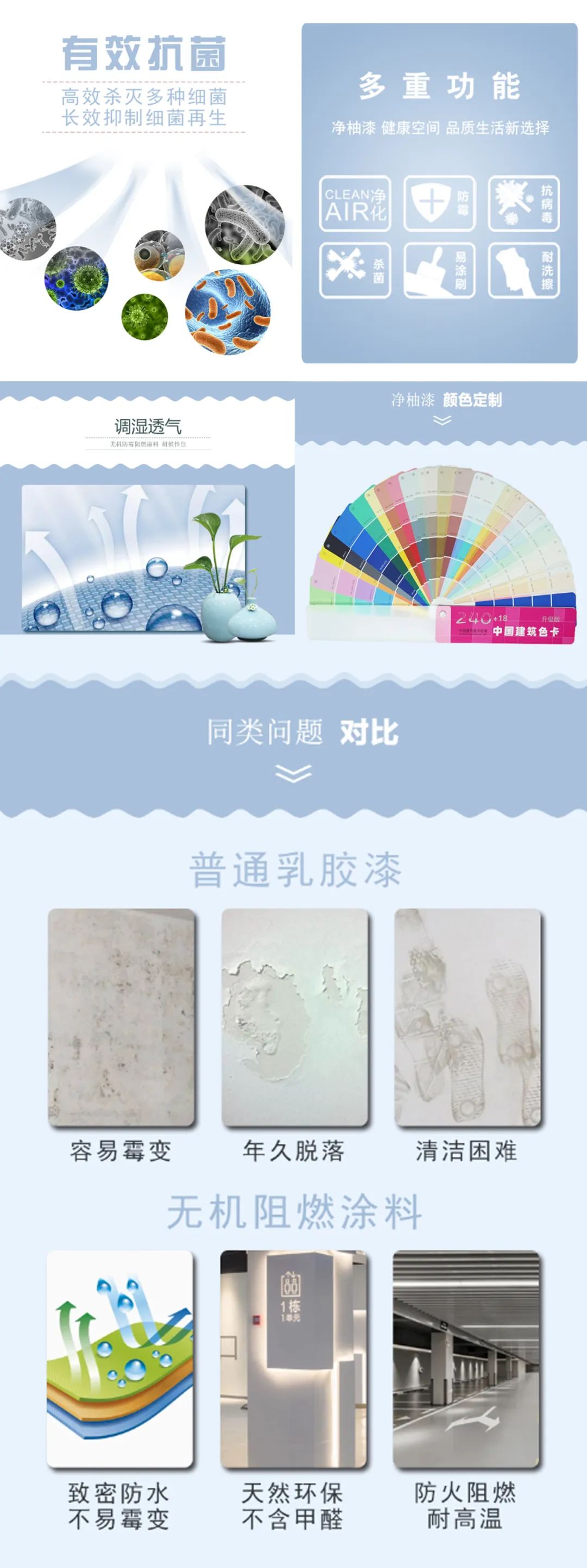 ● 透氣調(diào)濕 漆膜表面多孔,涂層透氣性良好,可調(diào)節(jié)墻體內(nèi)部的水分,避免墻面空鼓、返堿、發(fā)霉、結(jié)露等弊病。