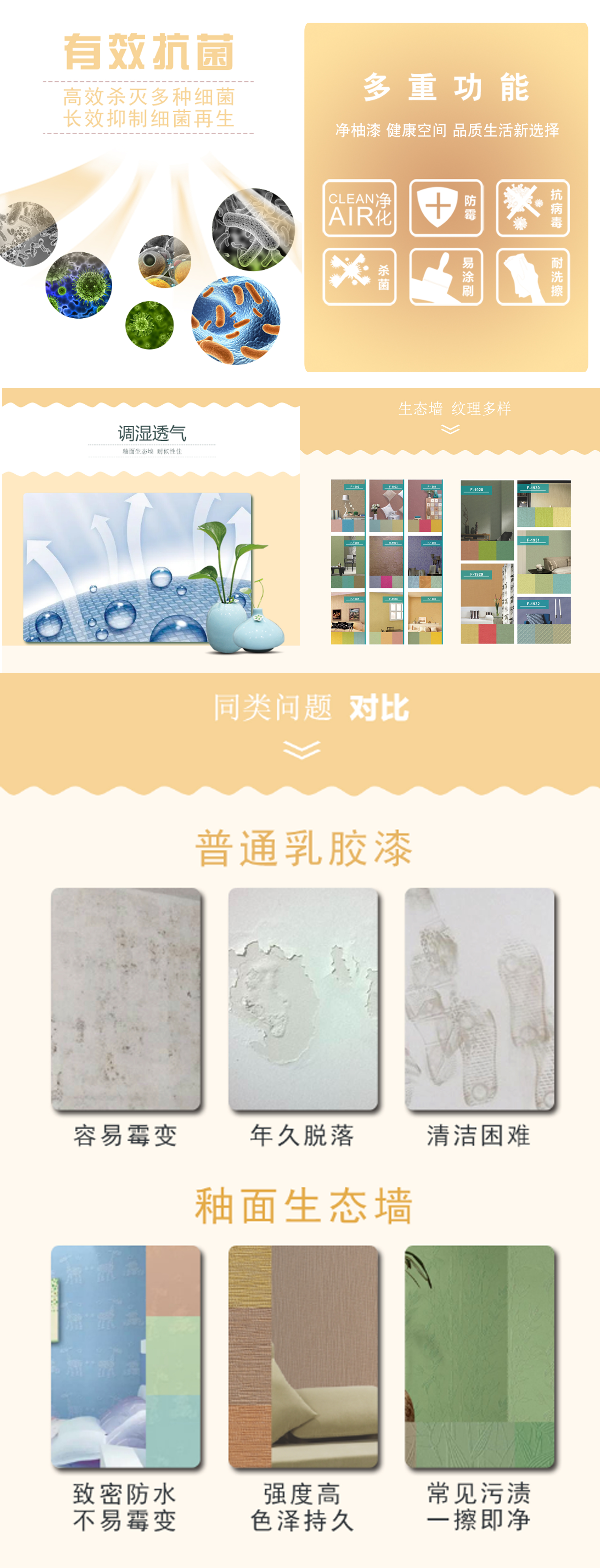 壁布專用絲光漆是一種集涂料、壁紙雙重效果為一體的新式墻體裝修方案。該系列既能解決墻面開裂、返堿和起皮等問題,又豐富了墻面造型,實(shí)現(xiàn)了功能性與裝飾性的完美結(jié)合。釉面生態(tài)墻可呈現(xiàn)墻面立體、多樣的圖案紋理和質(zhì)感,有及其豐富的裝飾表現(xiàn)力,能滿足個(gè)性化的審美需求。涂層強(qiáng)度高、耐擦洗、色澤持久,具有極高的實(shí)用性、觀賞性和藝術(shù)性。